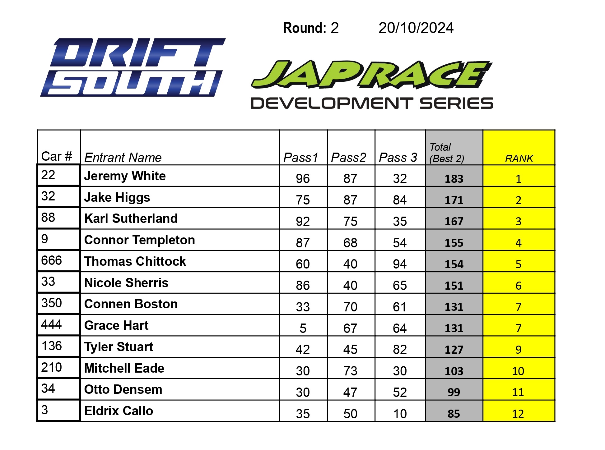 Development Series: 1- Jeremy White 2- Jake Higgs 3- Karl Sutherland Qualifying